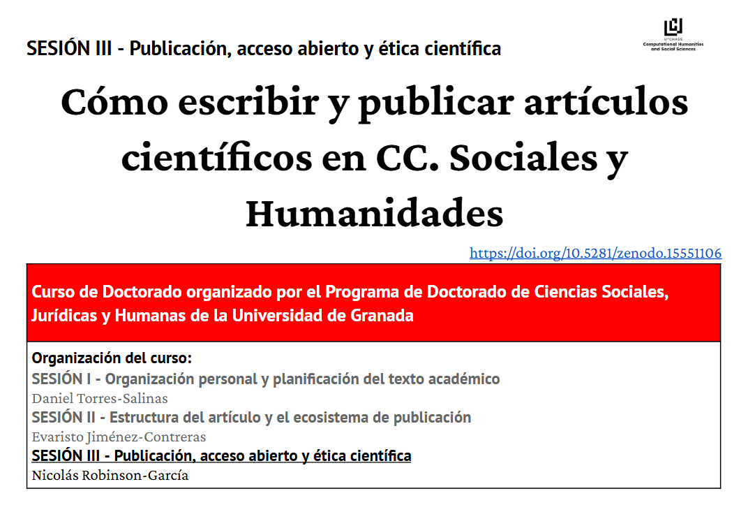 Last Tuesday I taught the 3rd session of the course ‘Cómo escribir y publicar artículos científicos en Ciencias Sociales y Humanidades’. This is a course I have taught for several years along with my colleagues Daniel Torres-Salinas and Evaristo Jiménez-Contreras. We normally end up switching sessions based on availability and tend to change contents on the fly, but this time we went for organization and method, and Dani created a nice layout which followed a sensible workflow (you can have a look at it at the end of the post, all in Spanish).